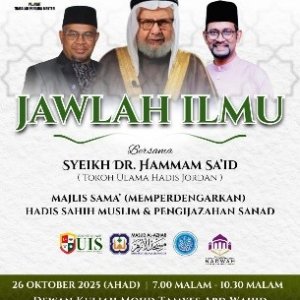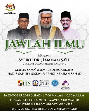 26 Oktober 2025 (MAA) - Alhamdulillah, Jawlah Ilmu bersama Syeikh Dr. Hammam Sa’id telah berlangsung dengan jayanya bertempat di Dewan Kuliah Mohd Tamyes Abd Wahid UIS. Dianggarkan seramai 300 orang peserta yang hadir dari kalangan mahasiswa UIS & orang awam.